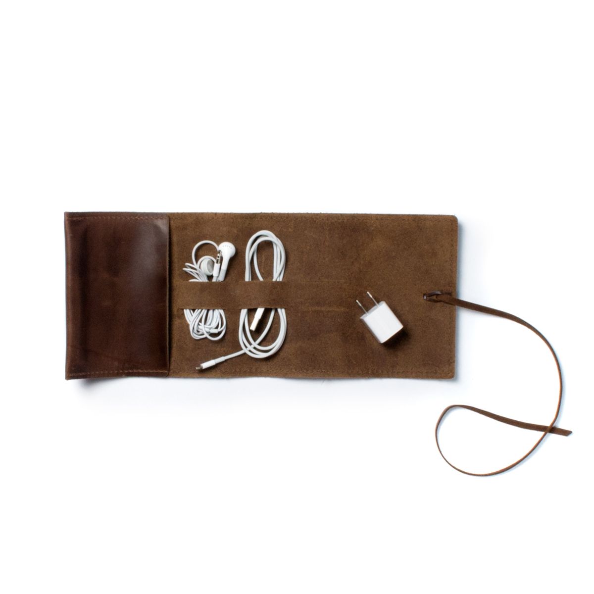 Protect your electronic gear in a roll-up case built for travel. When it’s unrolled you have three cord slots and a pouch for power adaptors and thumb drives. Rolled up you'll have a precision-sewn wrap tie bundle that fits comfortably inside any bag and especially well inside any of our satchels or totes.